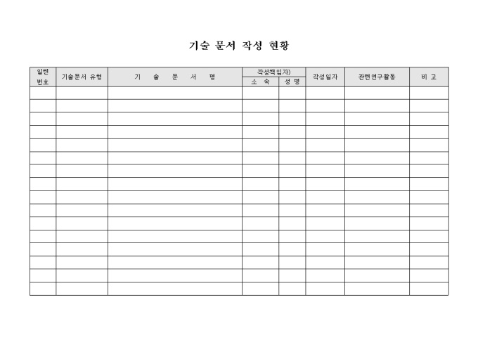 기술 문서의 작성 현황을 파악하기 위한 기술 문서 작성 현황 서식으로 기술문서 유형과 기술 문서명 , 작성책임자, 작성이자 등의 항목으로 구성되어 있습니다.
