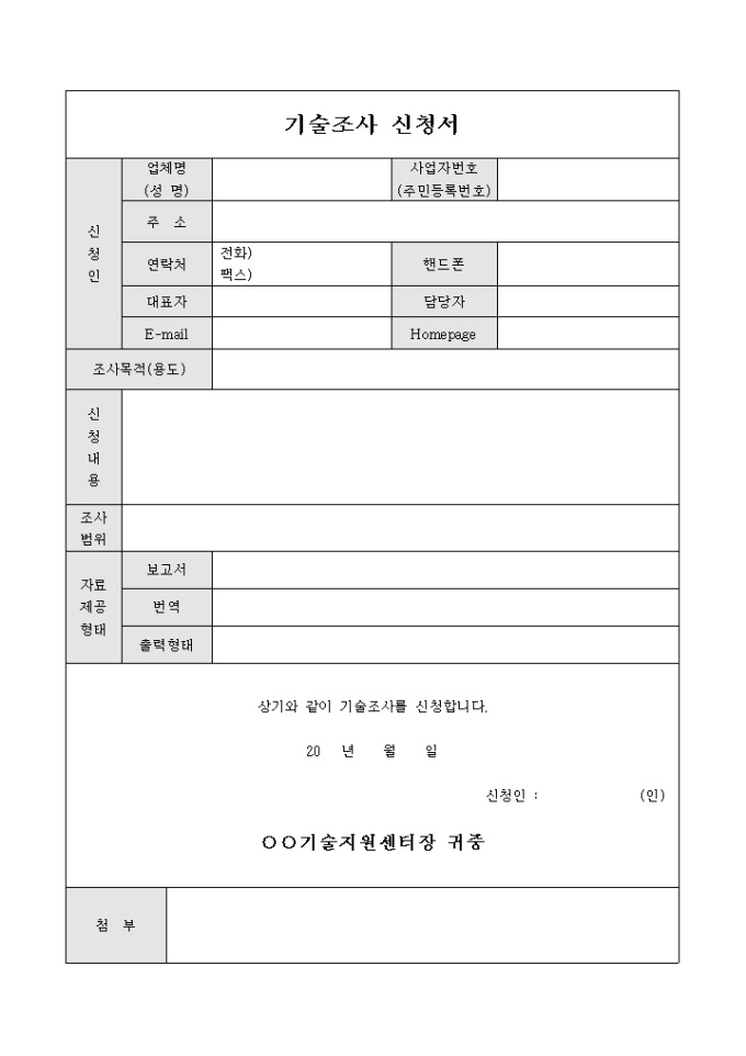 9,000원/월기술지원센터장에게 기술의 조사를 신청하는 내용의 기술조사 신청서 양식입니다. 신청인의 인적사항과 조사목적, 신청내용, 자료제공 형태 등의 항목에 대하여 작성할 수 있습니다.