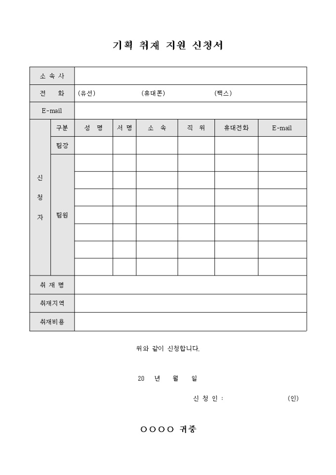 9,000원/월기업의 취재를 지원하기 위한 기획 취재 지원 신청서 양식입니다. 취재를 지원한 자의 소속사, 전화, 팀장/팀원들의 인적사항을 기재할 수 있도록 구성되어 있습니다.