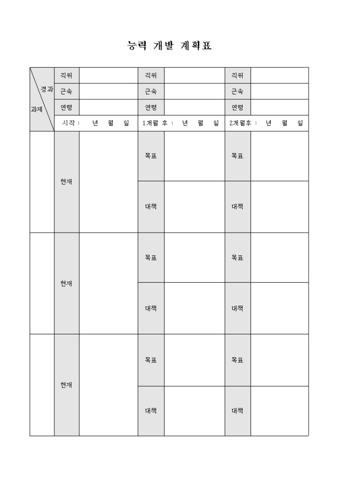 9,000원/월능력 개발을 위한 과제별로 현재 상황에 대하여 작성하고 과제를 달성하기 위한 목표 및 대책에 대하여 기록할 수 있는 능력 개발 계획표 양식입니다.