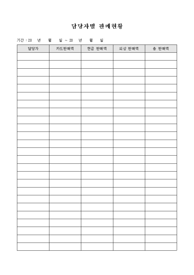 9,000원/월담당자별 판매현황 입니다. 담당자의 카드판매액과 현금 판매액, 외상 판매액을 기록 할 수 있습니다.