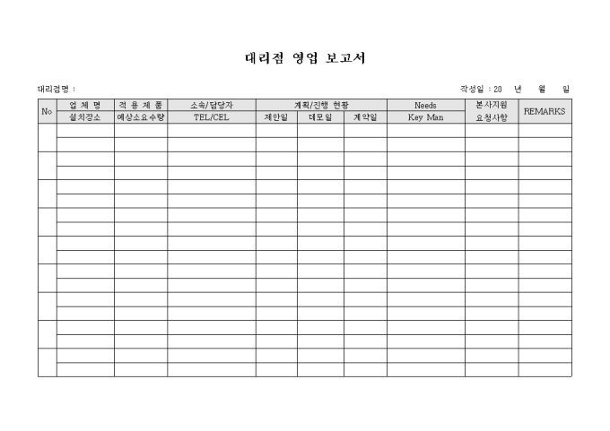 9,000원/월대리점 영업 내용을 세부적으로 기록한 대리점 영업 보고서입니다. 업체의 영업 현황을 확인 할 수 있도록 구성되어 있습니다.