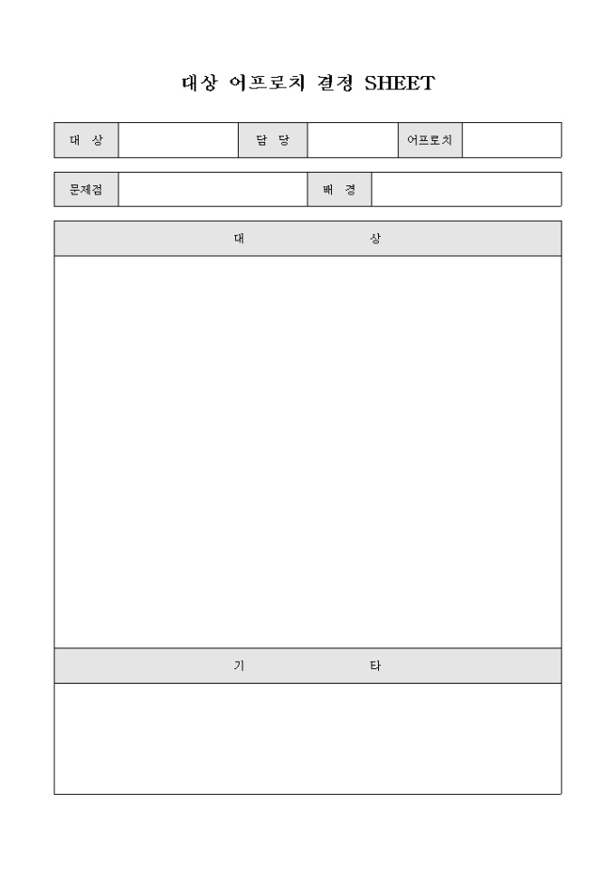 9,000원/월거래 대상에 대하여 어프로치의 결정을 위한 대상 어프로치 결정 SHEET 양식으로 대상과 어프로치, 어프로치에 대한 문제점, 배경, 대상의 내용 등의 항목으로 구성되어 있습니다.