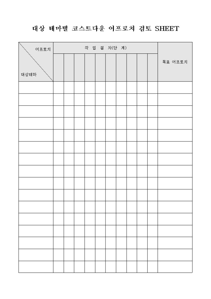 9,000원/월거래 대상에 대한 비용 절감을 위해 대상 테마별로 작업 절차 방법을 검토하는 내용의 대상 테마별 코스트다운 어프로치 검토 SHEET 양식입니다.