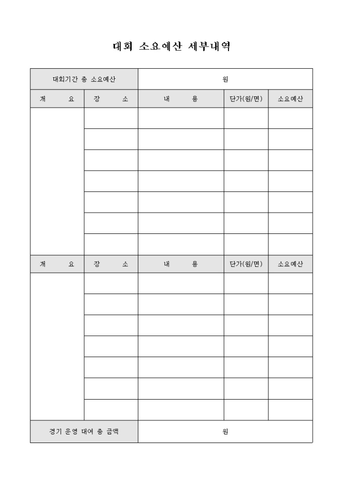 해당 대회의 총 소요예산의 세부 내역을 기록할 수 있는 대회 소요예산 세부내역 서식으로 대회가 이루어지는 장소별 내용에 따른 소요예산을 기재할 수 있습니다.