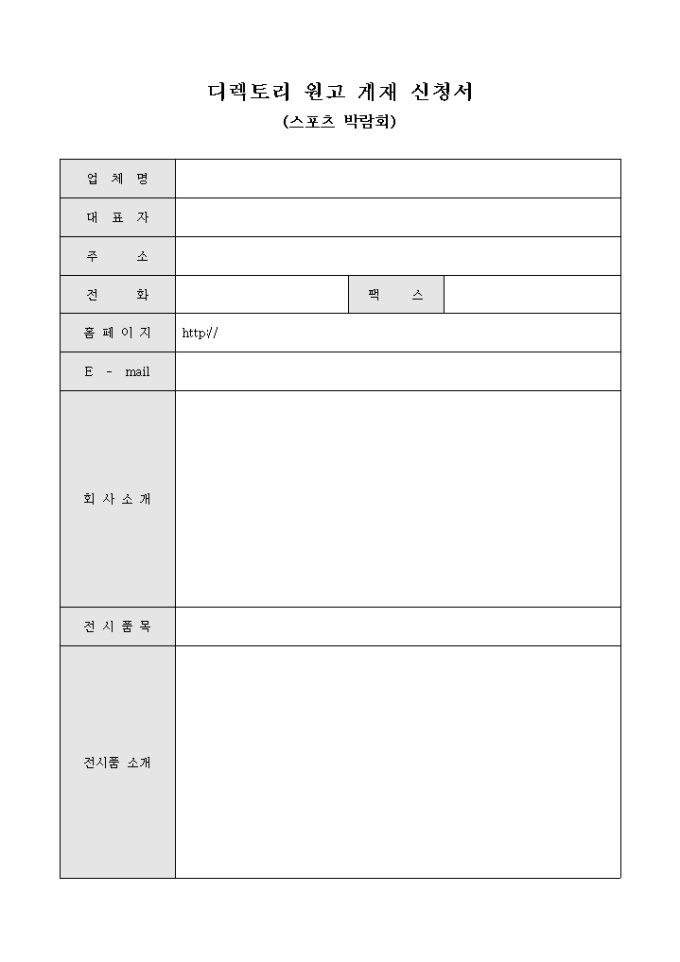 9,000원/월스포츠 박람회와 관련하여 디렉토리 원고를 게재하고자 할 때 그에 관련 사항을 기입하고 회사소개, 전시품 소개의 항목을 서술형태로 작성할 수 있게끔 제작된 서식입니다.