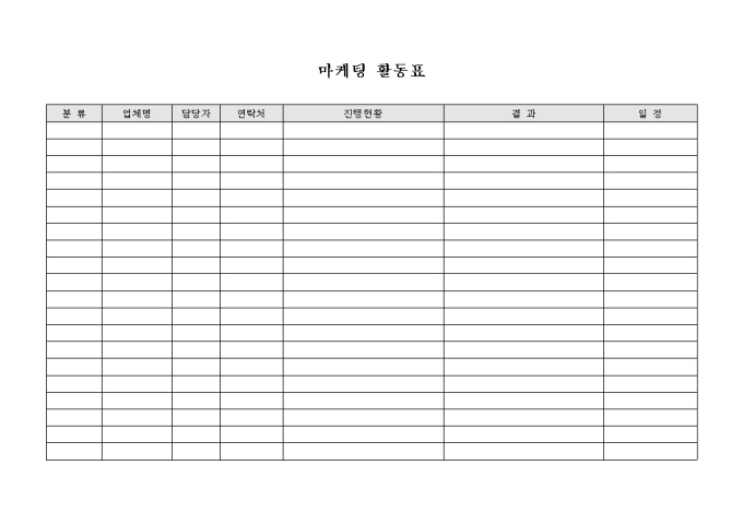 9,000원/월업체별 마케팅 활동의 진행현황과 결과 및 일정을 기록하여 마케팅활동을 관리 할 때 사용하는 활동표 입니다.