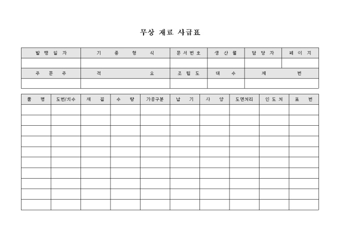 9,000원/월무상으로 지급되는 재료에 대한 주문사항과 재료가 소요되는 품목에 대한 세부 항목을 기록할 수 있도록 구성된 무상 재료 사급표 양식입니다.