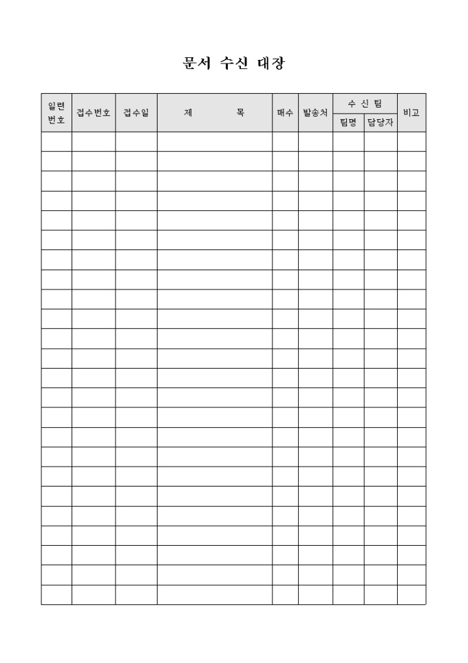 9,000원/월문서의 수신 내역을 기록하기 위한 문서 수신 대장 양식입니다. 문서의 접수번호와 접수일, 제목, 매수, 발송처, 수신팀 등의 항목으로 구성되어 있습니다.