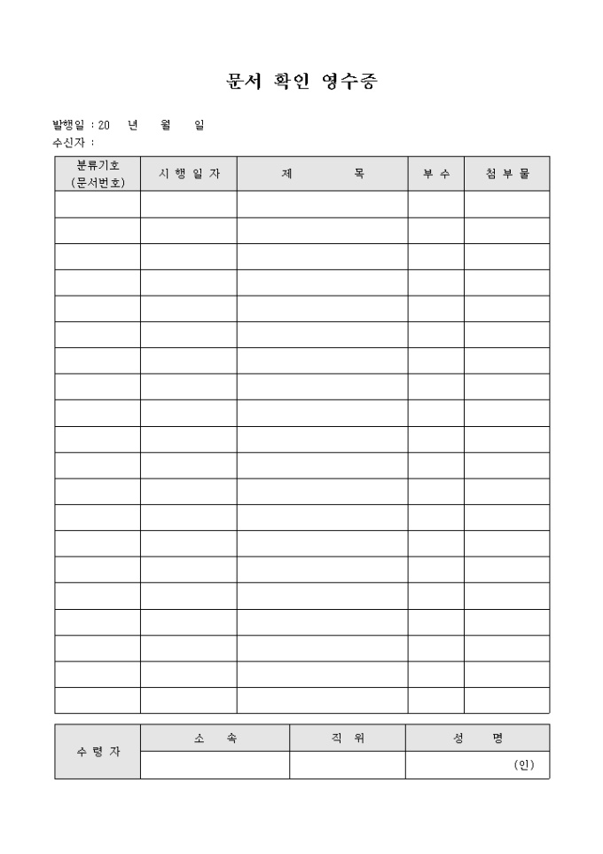 문서를 수령한 사람이 문서에 대한 목록을 작성하여 수신자에게 전달하였음을 확인하는 문서 확인 영수증 서식입니다.