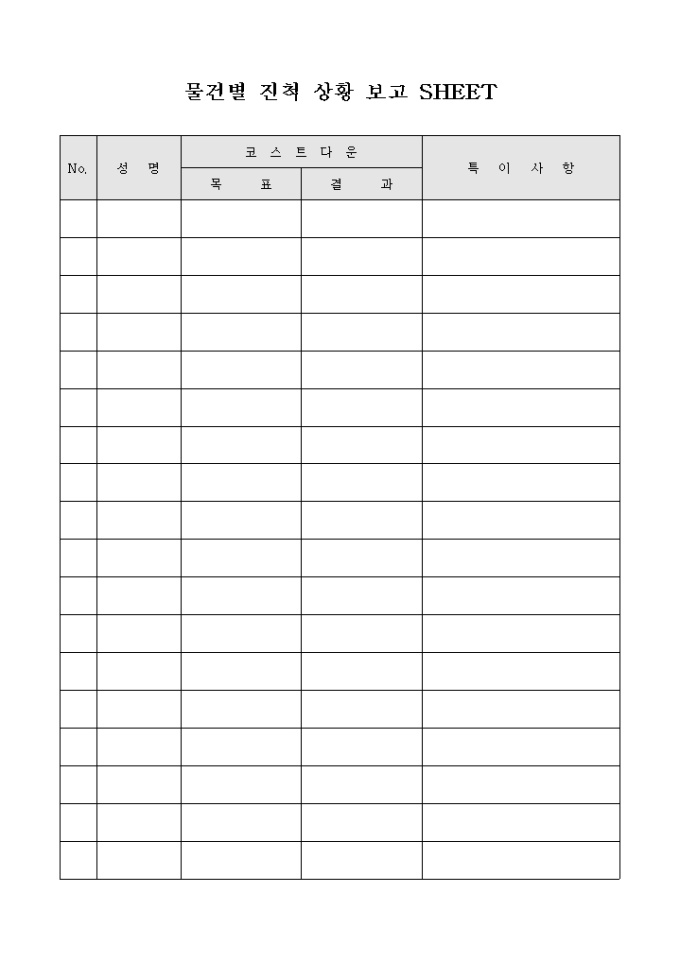 9,000원/월물건별 비용 절감에 대한 진행 상황을 보고하기 위한 물건별 진척 상황 보고 SHEET 양식으로 담당자의 성명과 코스트 다운의 목표 및 결과와 특이사항을 기재할 수 있습니다.