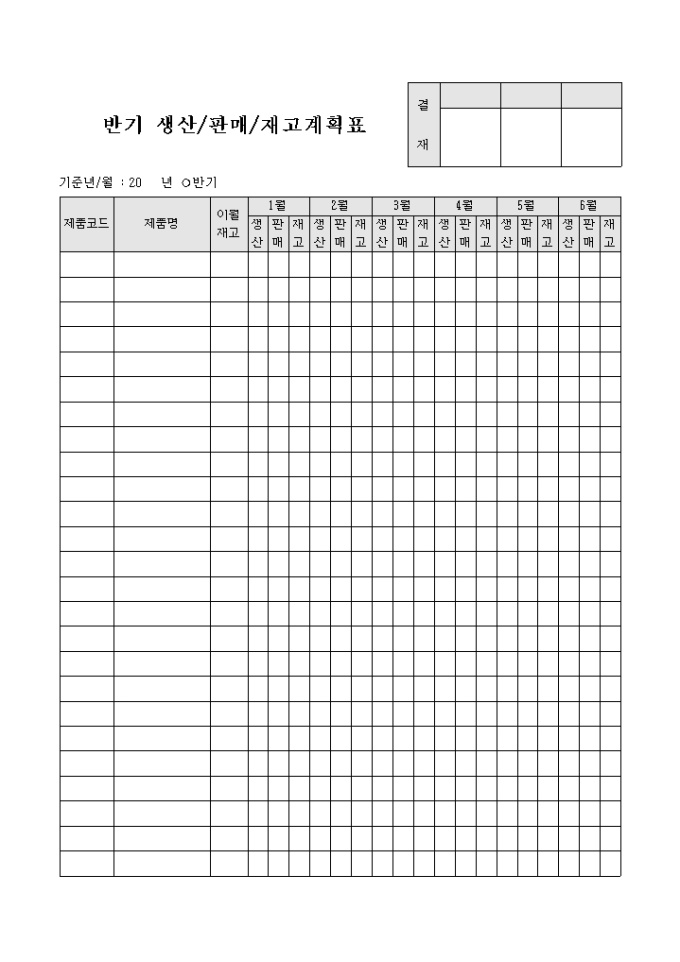 9,000원/월반기 생산 / 판매 / 재고계획표 입니다. 월별 제품의 생산, 판매, 재고 상황을 기록 할 수 있도록 구성되어 있습니다.