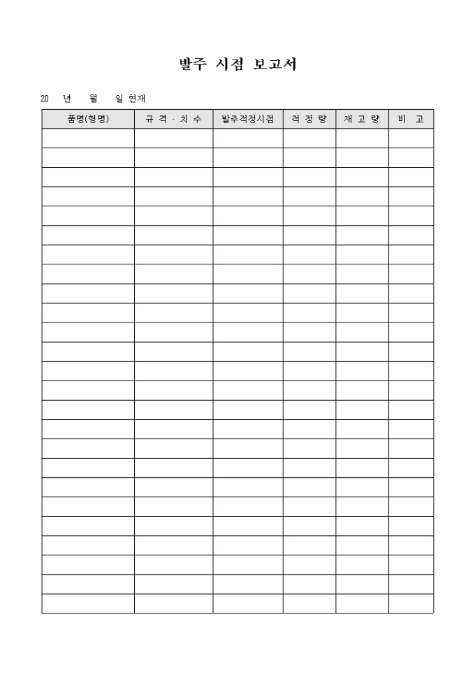 제품의 발주를 주문하기 위한 시점을 파악하여 보고하기 위하여 작성하는 발주 시점 보고서 양식입니다. 제품명과 규격/치수, 발주 적정 시점 및 적정량과 재고량 등의 항목을 작성할 수 있습니다.
