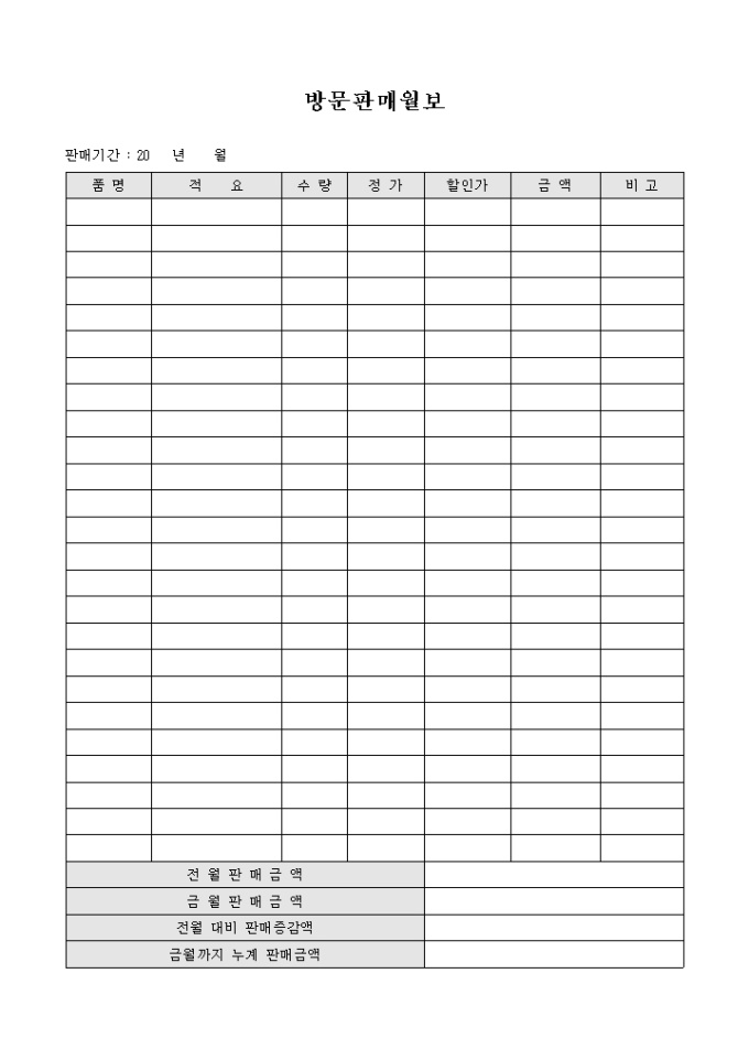 9,000원/월방문판매에 대한 월간 기록을 남길 때 사용하는 방문판매 주보입니다. 수량과 단가, 금액을 기록 할 수 있습니다.