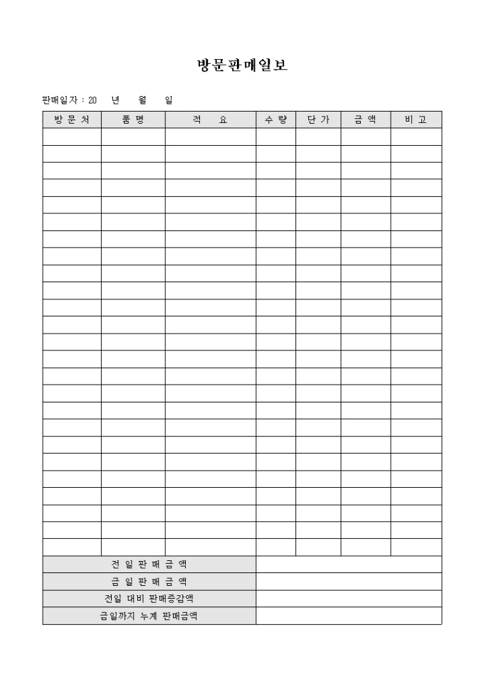 방문판매에 대한 일간 기록을 남길 때 사용하는 방문판매 주보입니다. 수량과 단가, 금액을 기록 할 수 있습니다.