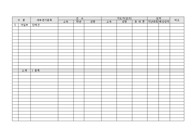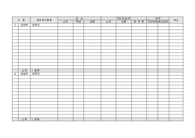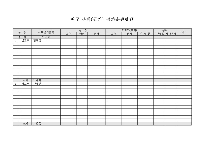 배구 부원중 하계(동계) 강화훈련에 참가하는 선수와 지도자의 명단을 관리하기 위해 만들어졌으며 종목별로 구분이 가능하며 지난대회 성적과 이번대회 예상 성적을 기입할 수 있게끔 제작된 서식입니다.