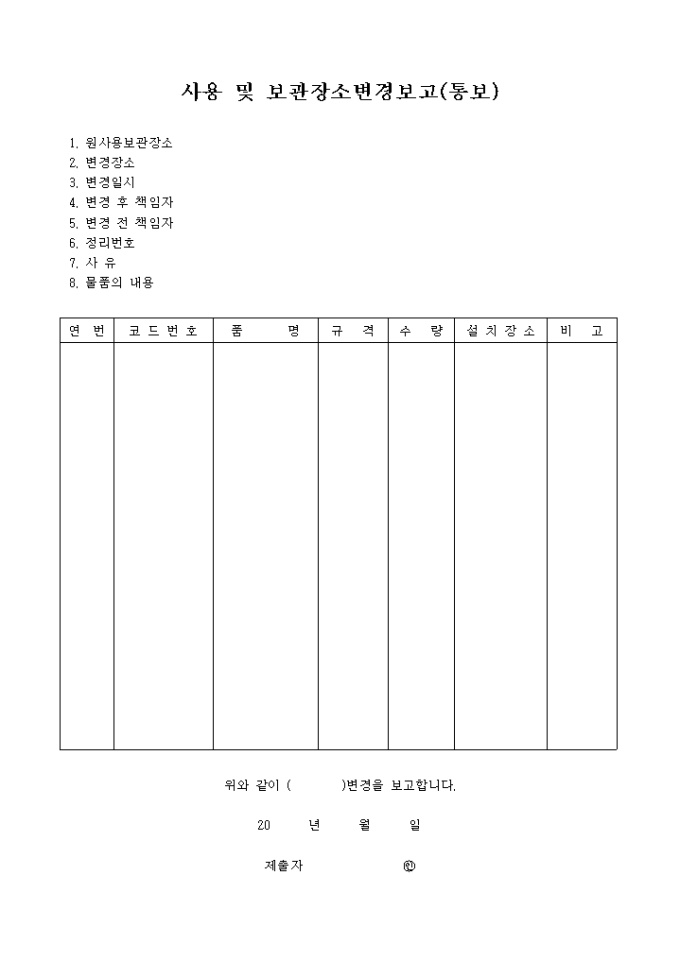 원사용보관장소,변경장소,일시,변경전(후) 책임자,정리번호,사유,물품의내용을 기록하는 양식입니다.