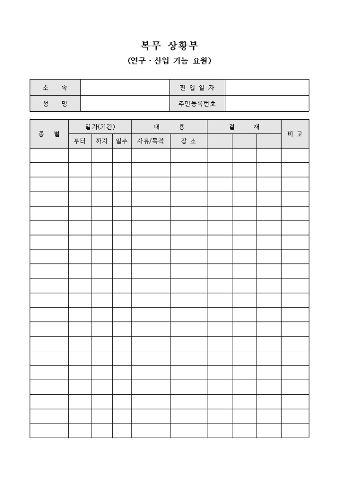 9,000원/월연구 및 산업 기능 요원의 복무 상황을 기록하는 복무 상황부 양식입니다. 해당인원의 소속, 성명 등과 복무 기간 및 내용에 대하여 기재할 수 있습니다.