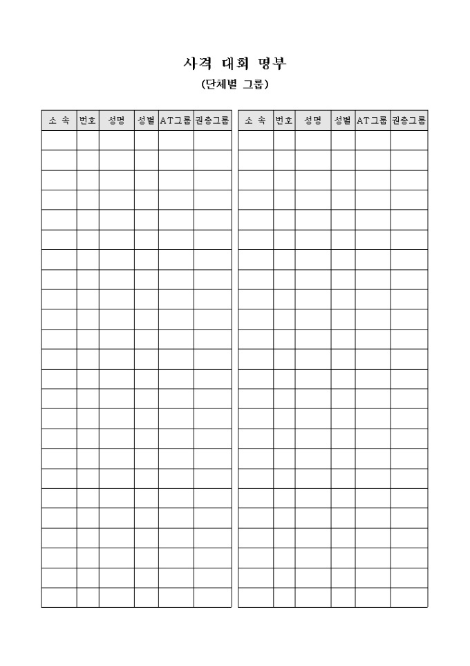9,000원/월사격 대회 단체전에 참가한 인원들의 명단을 효율적으로 관리하기 위해 만들어졌으며 AT그룹과 권총그룹으로 구분하여 사용할 수 있게끔 제작된 서식입니다.
