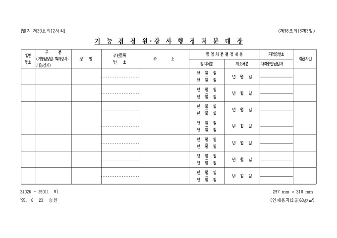 별지 제29호의12서식 기능검정원,강사행정처분대장입니다.(가로서식)