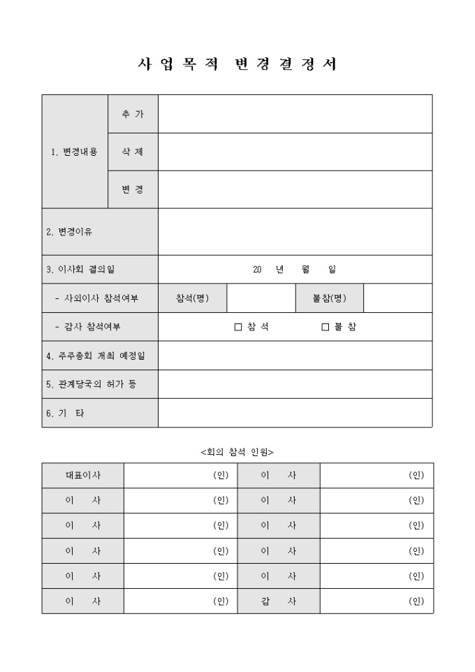 진행중인 사업에 대하여 기존 사업 목적의 추가/삭제/변경을 결정하기 위한 사업목적 변경 결정서 양식으로 변경내용과 변경이유, 이사회 결의일, 주주총회 개최 예정일 등의 항목으로 구성되어 있습니다.