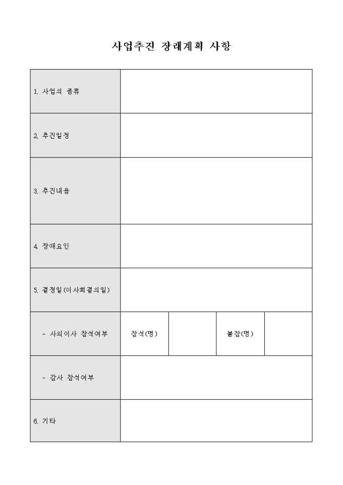 사업의 추진을 위한 장래 계획 사항을 기재할 수 있는 사업 추진 장래 계획 사항 서식으로 사업의 종류와 추진일정, 추진내용, 장해요인 등의 항목으로 구성되어 있습니다.