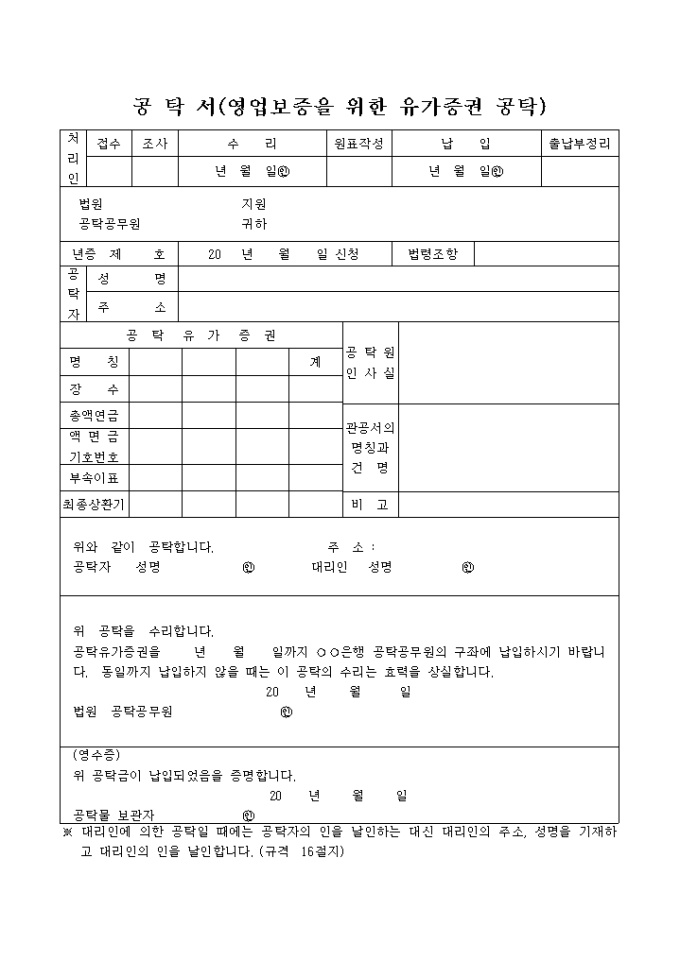 9,000원/월영업보증을위한유가증권공탁에 관한 공탁서 양식입니다. 처리인, 공탁자정보, 공탁유가증권등의 내용을 기입하도록 되어 있고 공탁금 납입 영수증까지 구성되어 있습니다.