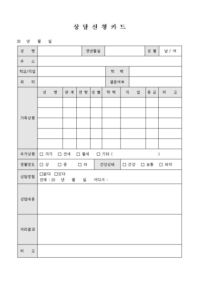 9,000원/월상담 신청에 대한 내용과 정보를 기록한 상담 신청 카드입니다. 상담내용과 처리 결과를 서술 할 수 있도록 구성되어 있습니다.