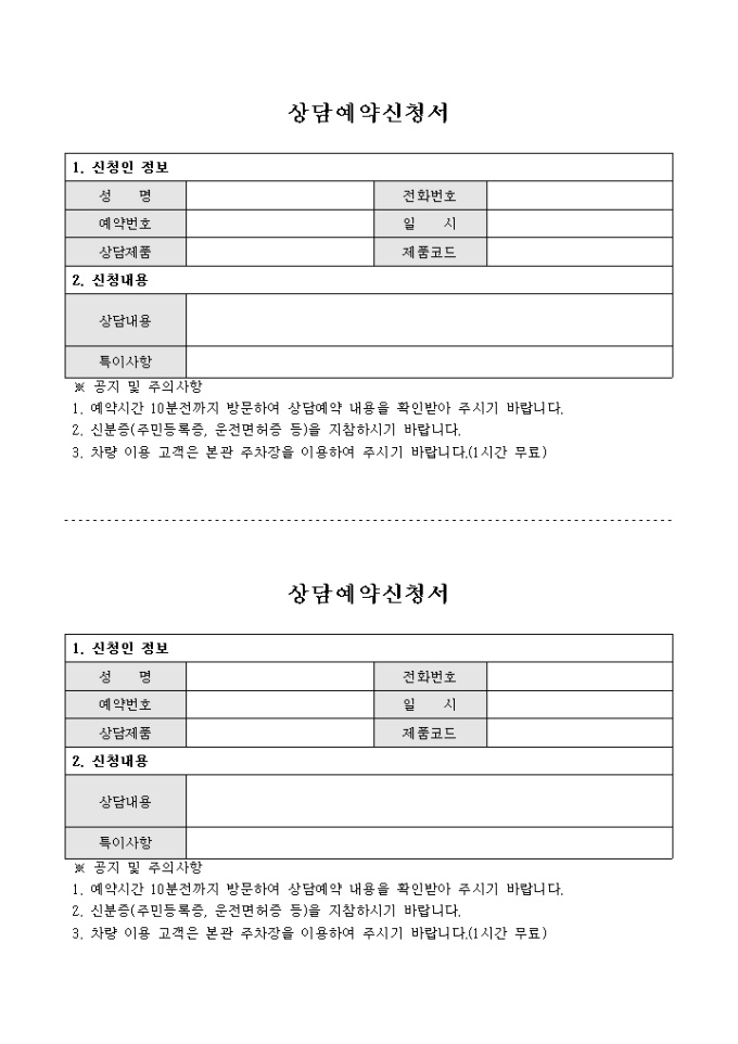 2부로 나누어 사용이 가능한 상담 예약 신청서입니다. 신청인의 정보과 상담신청내용을 기록시 사용합니다.