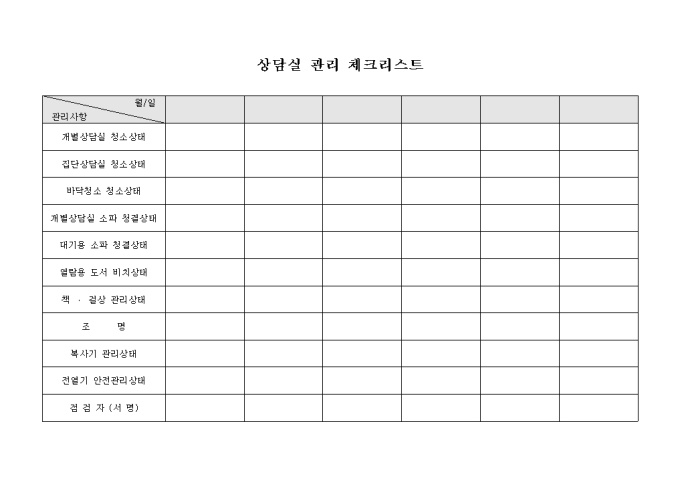 9,000원/월각 상담실의 청소상태와, 청결상태, 관리상태를 확인시 사용하는 체크리스트입니다.