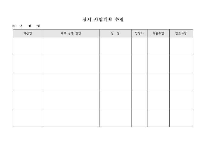 9,000원/월상세한 사업계획을 수립하기 위해 작성하는 상세 사업계획 수립 서식으로 개선안, 세부실행방안, 일정, 담당자, 자원투입, 협조사항 등의 항목으로 구성되어 있습니다.