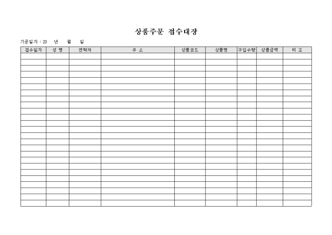 9,000원/월상품 주문의 접수를 효율적으로 관리하기 위해 만들어졌으며 일자, 고객의 인적사항, 상품에 관한 정보 등을 기재하여 사용할 수 있도록 제작된 서식입니다.