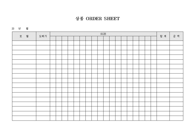 9,000원/월월별 상품 주문 내역을 확인 할 때 사용하는 상품 오더 시트입니다. 모델별 상품 도매가와 사이즈를 기록 할 수 있습니다.