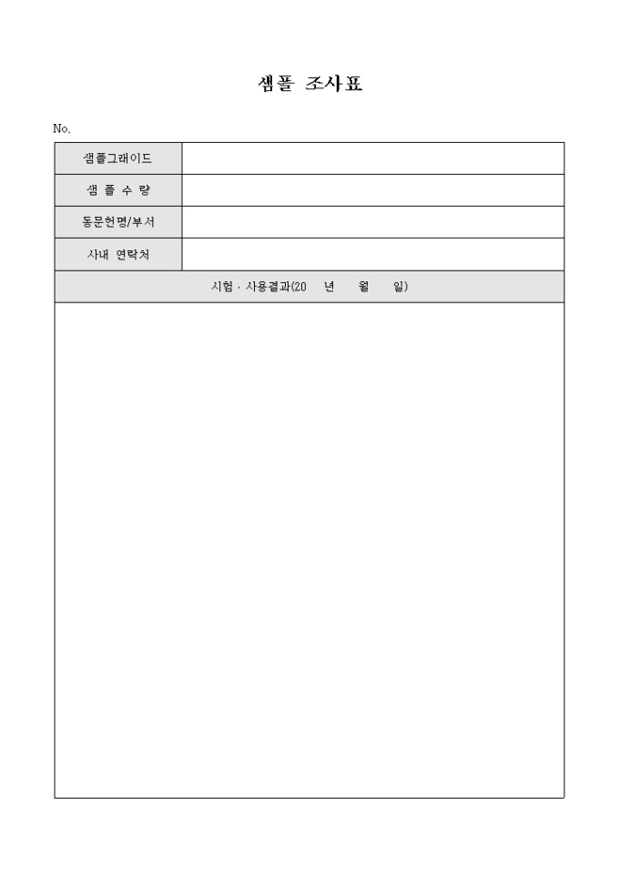 샘플에 대하여 사전 시험 내용과 사용 결과를 기록할 수 있도록 구성된 샘플 조사표 양식입니다.