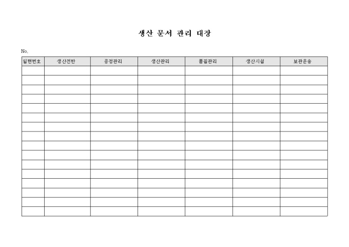 9,000원/월생산 업무에 관하여 작성된 문서를 관리하기 위한 생산 문서 관리 대장 양식으로 생산전반, 공정관리, 생산관리, 품질관리, 생산시설, 보관운송 등의 항목으로 구성되어 있습니다.