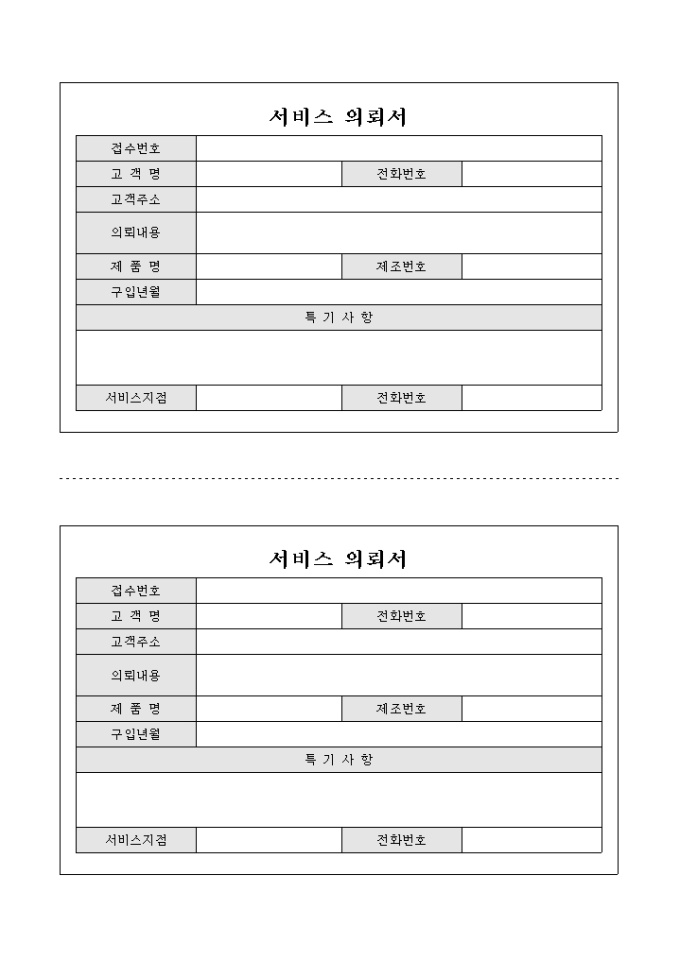 서비스 의뢰를 희망하여 신청하고자 할 때 사용할 수 있도록 만들어졌으며 접수번호, 고객 인적사항, 의뢰내용, 특기사항의 항목으로 구성되어 있으며 2등분되어 있습니다.