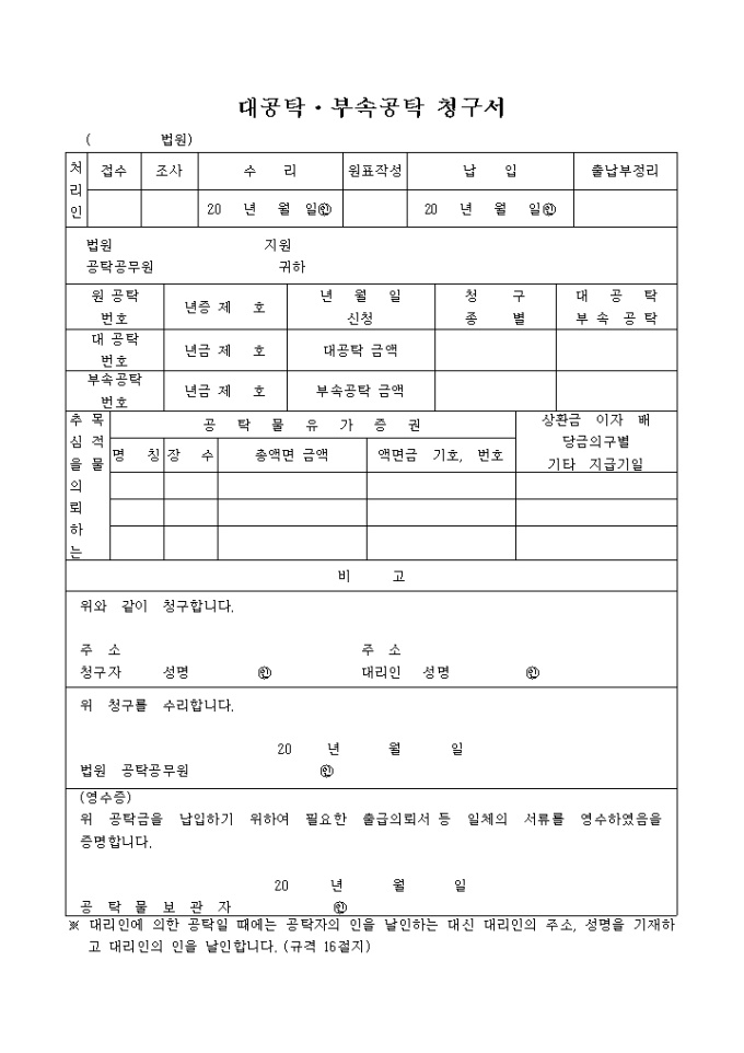 처리인 사항과 공탁물유가증권내용등을 기재하여 공탁청구와 그에 대한 수리, 납부영수를 확인할 때 사용합니다.