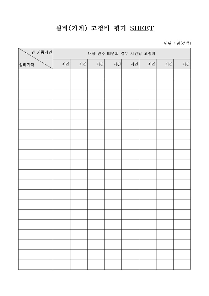 9,000원/월설비 또는 기계의 가동시간당 고정비를 평가하기 위하여 작성하는 설비(기계) 고정비 평가 SHEET 양식입니다.