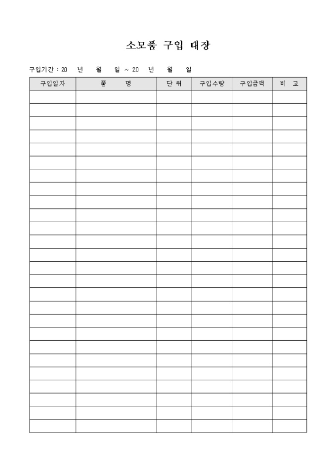 9,000원/월소모품의 구입 내역을 기록하는 소모품 구입 대장 양식으로 구입일자, 품명, 단위, 구입수량, 구입금액 등의 항목으로 구성되어 있습니다.