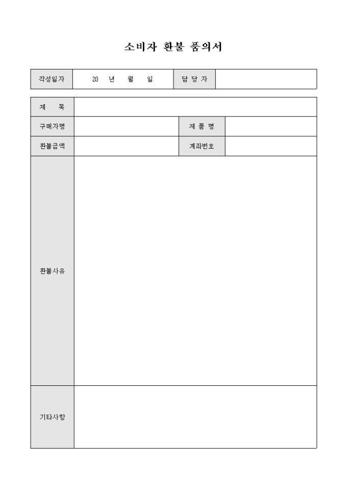 9,000원/월소비자가 제품의 환불을 요청해 왔을 때 상급자에게 보고하기 위하여 작성하는 소비자 환불 품의서 양식으로 구매자명과 제품명, 환불금액, 환불사유 등을 작성할 수 있습니다.