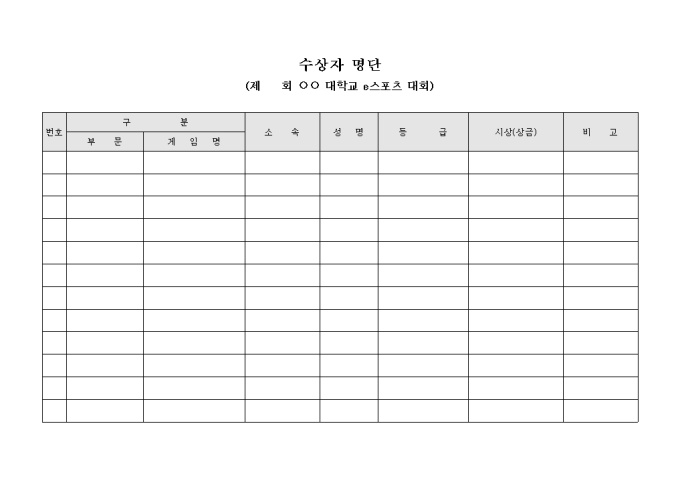 9,000원/월대학교에서 개최한 e스포츠 대회에서 수상자의 명단을 관리하기 위해 만들어졌으며 게임명에 따른 수상자 성명, 등급, 상금 등을 기입할 수 있게끔 제작된 서식입니다.