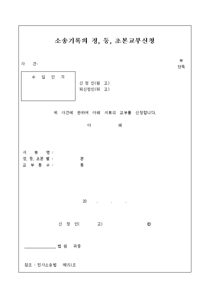 9,000원/월민사소송법 제151조에 의거 소속기록의 정, 등, 초본교부를 신청할 때 사용하는 양식입니다.