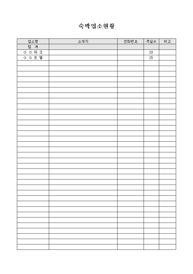 9,000원/월전지훈련, 합숙훈련을 계획할 때 해당 지역에 소재한 숙박업소의 연락처, 사용가능 객실의 현황을 관리하기 위하여 제작된 서식입니다.