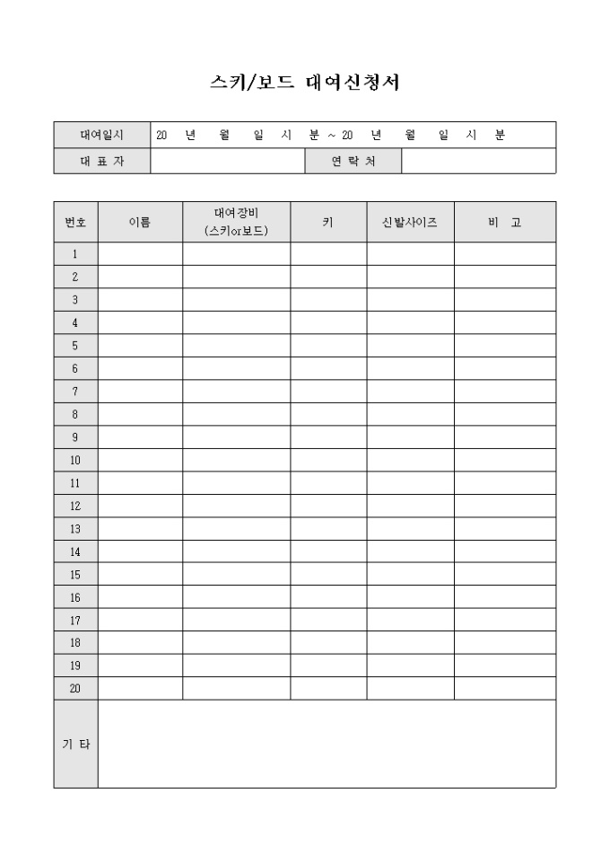 스키/보드 장비 대여를 희망하여 신청하고자 할 때 사용할 수 있도록 만들어졌으며 개인별 대여장비, 신체조건 등을 기입할 수 있는 명단이 포함된 서식입니다.