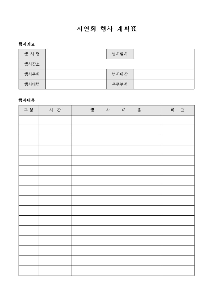 9,000원/월시연회 행사의 실시를 위한 행사 계획표 서식입니다. 시연회 행사에 대한 개요와 행사 진행 사항별 시간과 행사내용을 기재할 수 있습니다.