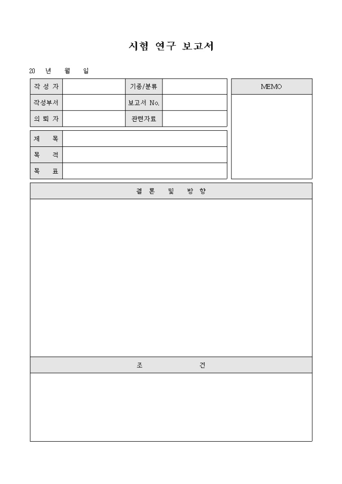 제품의 개발 등을 위해 시험적으로 연구한 내용을 보고하기 위한 시험 연구 보고서 서식으로 시험 연구의 제목과 목적, 목표, 연구를 통한 결론과 앞으로의 방향에 대한 항목을 작성할 수 있습니다.