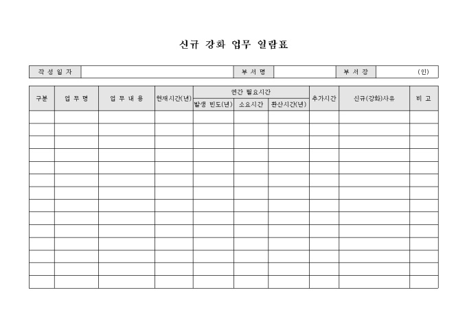 9,000원/월부서에서 수행중인 업무에 대해서 신규로 강화 해야될 업무에 대하여 기재하는 신규 강화 업무 일람표 서식입니다. 해당 업무별 업무내용과 연간 필요시간, 추가시간, 신규 강화 사유 등의 항목으로 구성되어 있습니다.