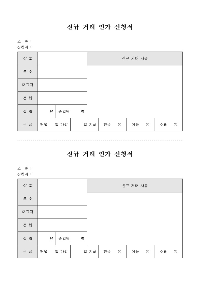 9,000원/월새로운 업체와의 거래를 허가받기 위하여 작성하는 신규 거래 인가 신청서 양식입니다. 해당 업체의 상호, 주소 대표자, 설립, 수금 내역과 신규 거래 사유 등을 기재할 수 있습니다.