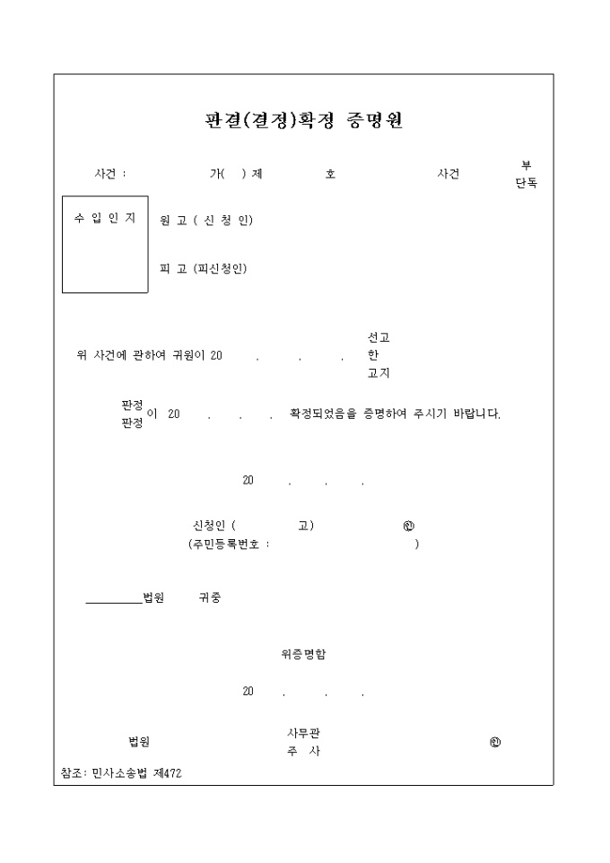사건에 관해 선고(고지)된 판정이 확정되었음을 증명요청하는 양식입니다.