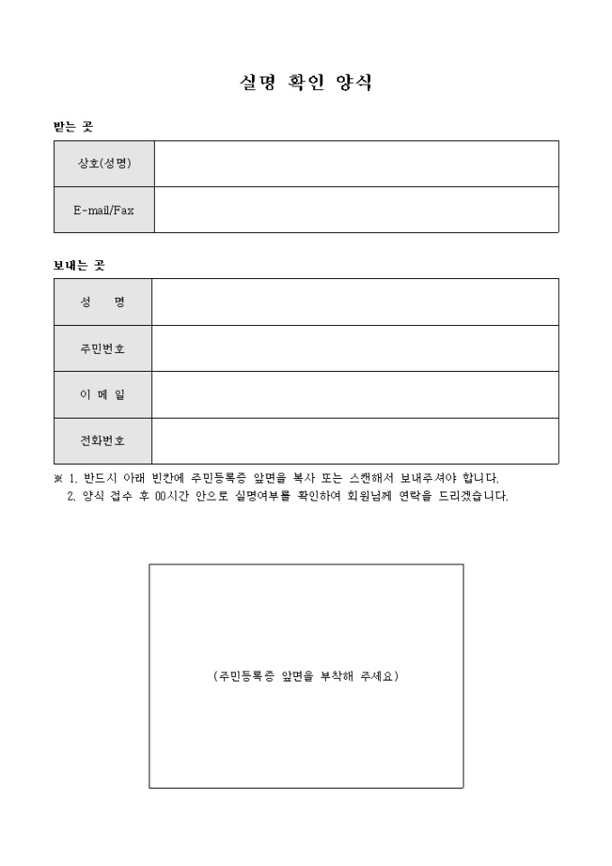 고객의 실명을 확인하기 위해 신분증의 복사 또는 스캔하여 첨부 후 내용의 발송을 요청하는 실명 확인 양식입니다.